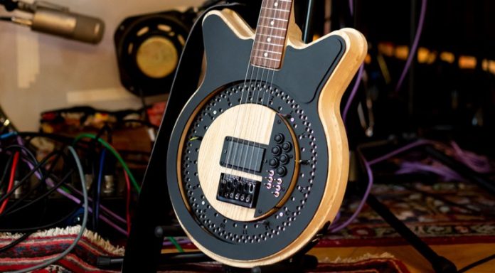 Gitara ma jesionowy korpus, podstrunnicę z palisandru i wycinaną laserowo matową czarną akrylową maskownicę, która zakrywa wewnętrzną elektronikę. To szalone okrągłe dzieło sztuki jest wytworem wyobraźni konstruktora Anthony’ego Dickensa i istnieje tylko jako prototyp, który od dwóch lat opracowywany jest w Makerversity w Londynie.