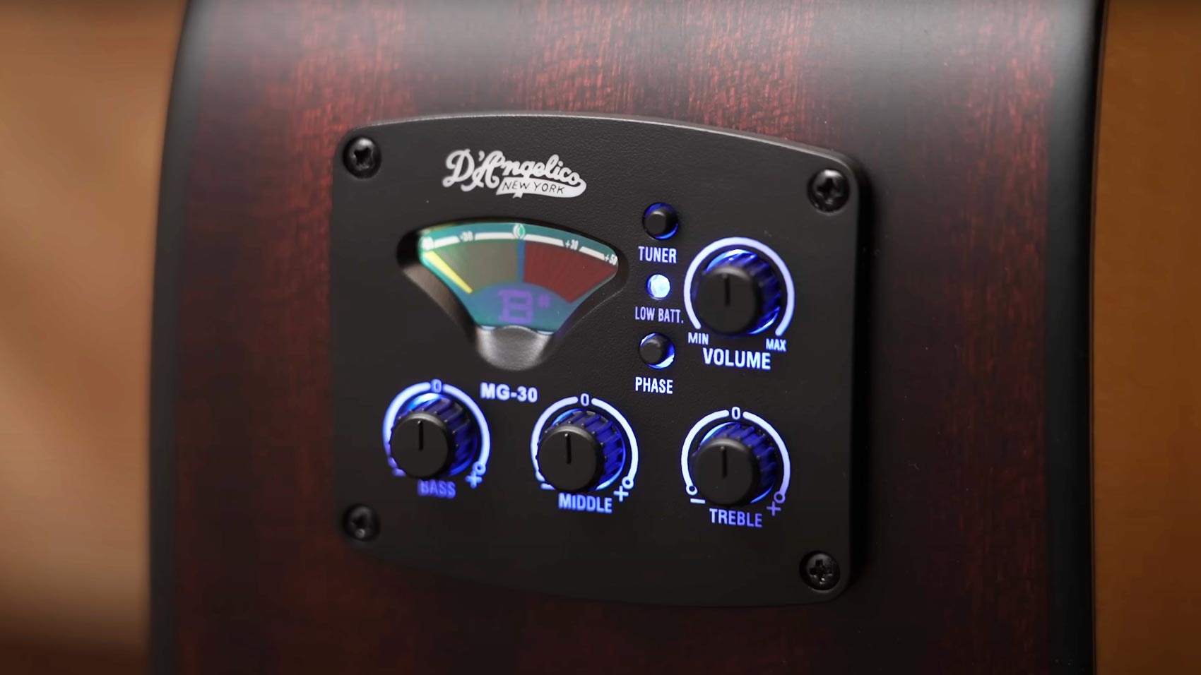 Za wzmocnienie odpowiada preamp D’Angelico MG‑30 z wbudowanym stroikiem. Panel oferuje regulację głośności, basów, środkowych i sopranów, a tuner jest w pełni podświetlany – całość jest przygotowana do szybkiego wyjścia na scenę.