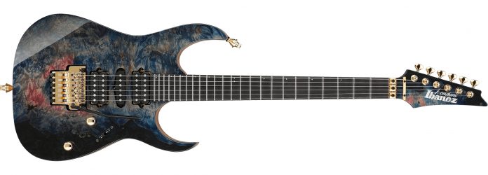 Podobnie jak w zeszłym miesiącu, także i tym razem mamy do czynienia z gitarą z linii J.Custom czyli pochodzącą z japońskiego custom shopu Ibaneza. Korpus o klasycznym kształcie RG wykonany jest z jesionu bagiennego, a wierzchnia nakładka z wzorzystego klonu uzupełnionego niebieską żywicą prezentuje się spektakularnie. Szyjka to 3-częściowy RG J.Custom Wizard z drewna wenge i klonu, a podstrunnicę stanowi drewno hebanowe. Na pokładzie znakomite trio przetworników DiMarzio: Air Norton (H) przy gryfie, True Velvet (S) w pozycji środkowej oraz The Tone Zone (H) przy mostku (Lo-Pro Edge).