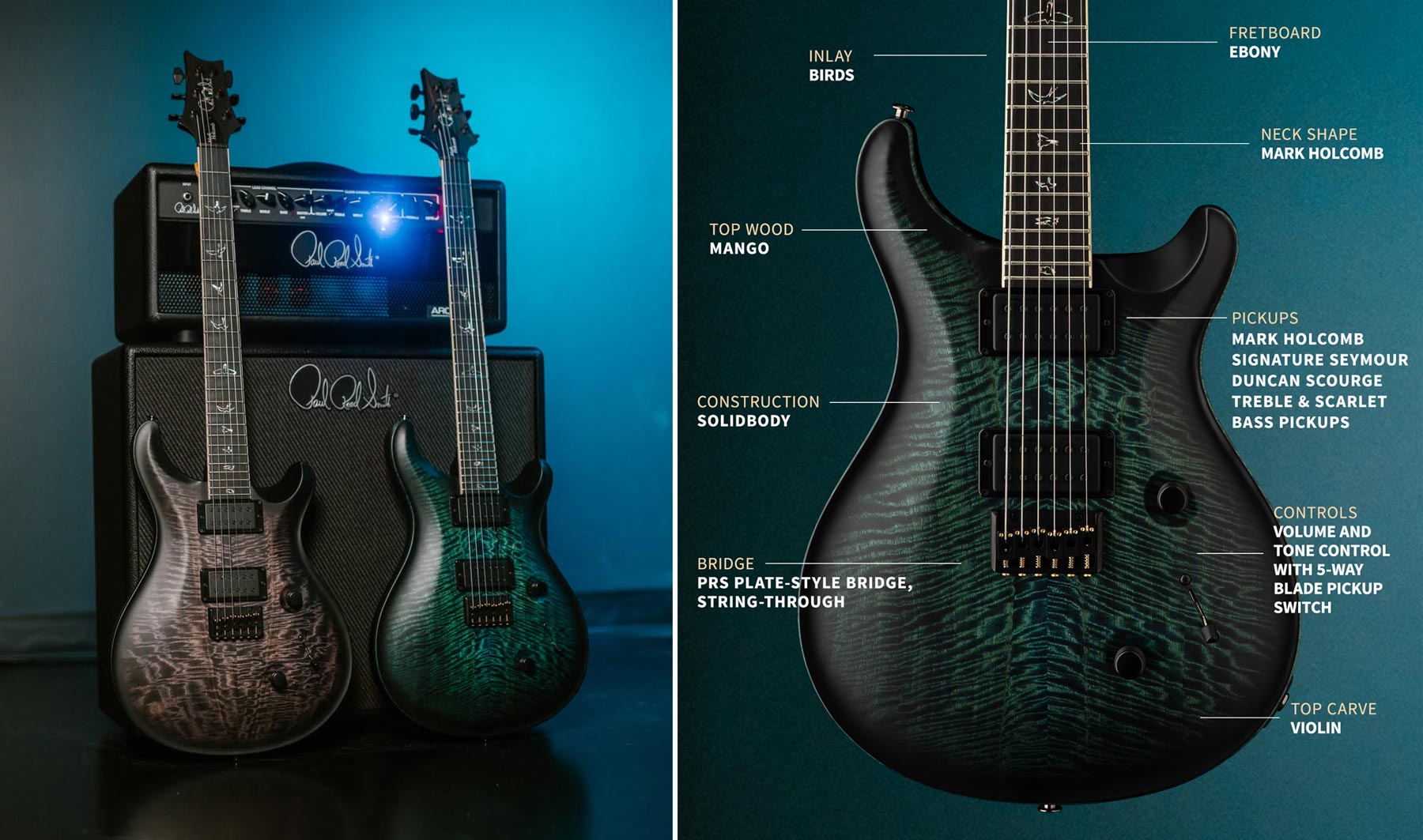 Znany z progresywnego metalu i charakterystycznego stylu riffowania, Mark Holcomb powraca z nowym instrumentem PRS. Główną nowością jest mango top, osadzony na lekkim korpusie z mahoniu i stylowo wykończony sześcioma dostępnymi wykończeniami w satynowym lakierze (m.in. Cobalt Smokeburst, Purple Mist Wraparound Burst).