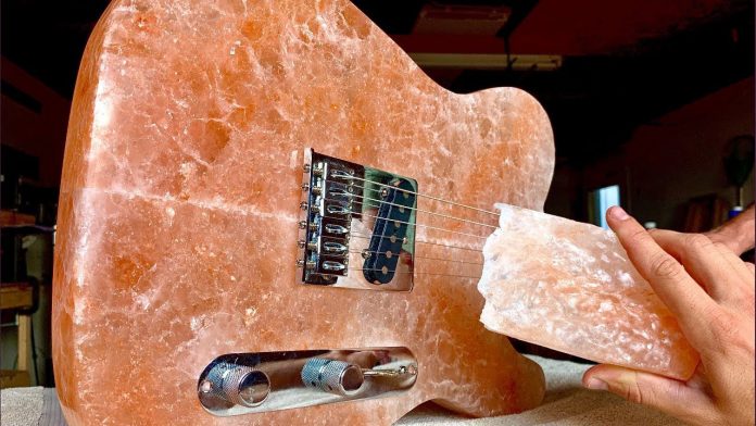 Kolejnym projektem wykorzystującym nietypowy materiał do budowy korpusu jest gitara wykonana z plastra himalajskiej soli. Trzeba przyznać, że wygląda imponująco, szczególnie pod słońce, ale czy jest praktyczna pod kątem użytkowym? Na pewno takiego “wiosła” lepiej nie zanurzać w wodzie…