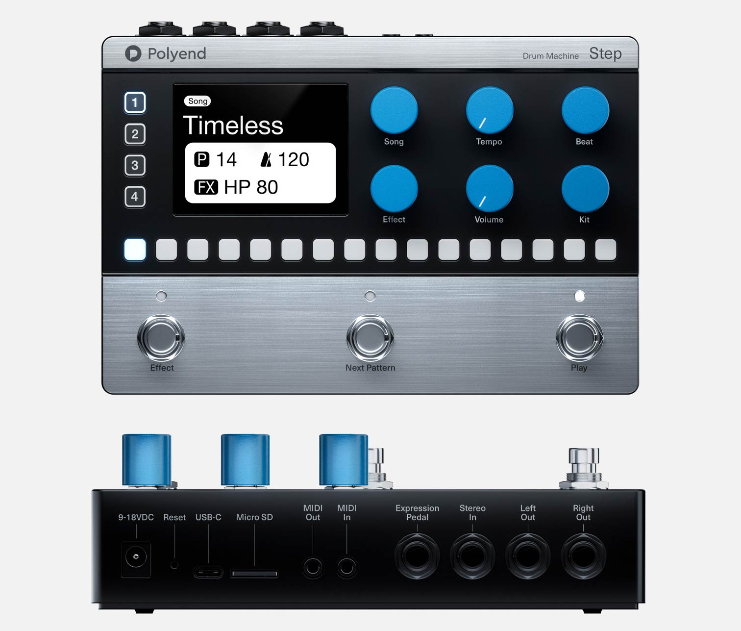 Polyend Step łączy funkcjonalność automatu perkusyjnego z wygodą obsługi pedałem. Urządzenie zostało wyposażone w 350 gotowych patternów rytmicznych oraz 200 zestawów perkusyjnych, co czyni je doskonałym narzędziem zarówno do ćwiczeń, jak i występów na żywo. Dla bardziej wymagających użytkowników dostępna jest możliwość programowania własnych rytmów – jeden pattern może mieć 16 kroków, a te można łączyć w bardziej złożone struktury utworów. Urządzenie pozwala na zapisanie ponad 1000 utworów.