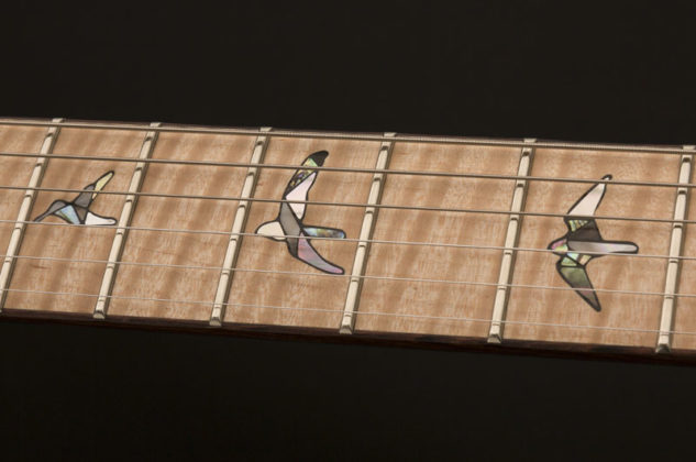 Główka i inkrustacje na gryfie, to wieńczące dzieło ozdoby z drewna paua, macica perłowa, oraz różowej muszli małży i czarnego nieporowatego corianu.