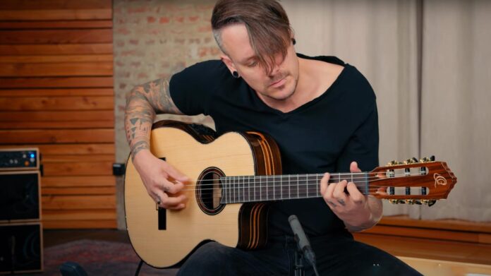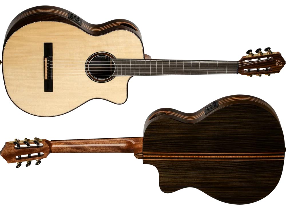Seria The Private Room od Ortega Guitars od lat przyciąga muzyków, którzy cenią sobie ręcznie selekcjonowane drewno, eleganckie wykończenie oraz niestandardowe rozwiązania konstrukcyjne. GRANDSUITE‑CE wpisuje się w tę filozofię, oferując pełnowymiarowy korpus w rozmiarze 4/4 z wycięciem typu cutaway, które ułatwia dostęp do najwyższych progów. Płyta wierzchnia wykonana została z litego europejskiego świerku, a tył i boki z palisandru, urozmaicone efektownymi wstawkami z klonu falistego, co nadaje gitarze unikalny wygląd i subtelnie rozjaśnia jej barwę.
