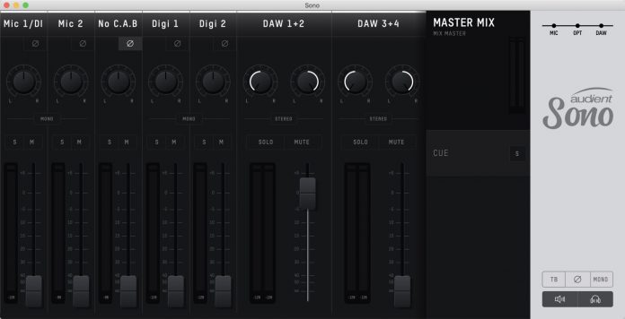 Nieodłącznym elementem cyfrowego interfejsu audio jest aplikacja wirtualnego miksera, umożliwiająca obsługę wszystkich jego funkcji i routing sygnału na ekranie komputera. W przypadku Sono jest to taka sama aplikacja, jaką mają w pakiecie pozostałe interfejsy Audient, dostosowana do jego specyfikacji. Wirtualny panel obsługi jest bardzo przyjazny, przejrzysty, z możliwością dopasowania widoku do naszych aktualnych potrzeb przez schowanie sekcji, których akurat nie potrzebujemy. Z jednej strony jest bardzo intuicyjny, z drugiej konkretny – ma wszystko to, co mieć powinien, bez zbędnych wynalazków i udziwnień.