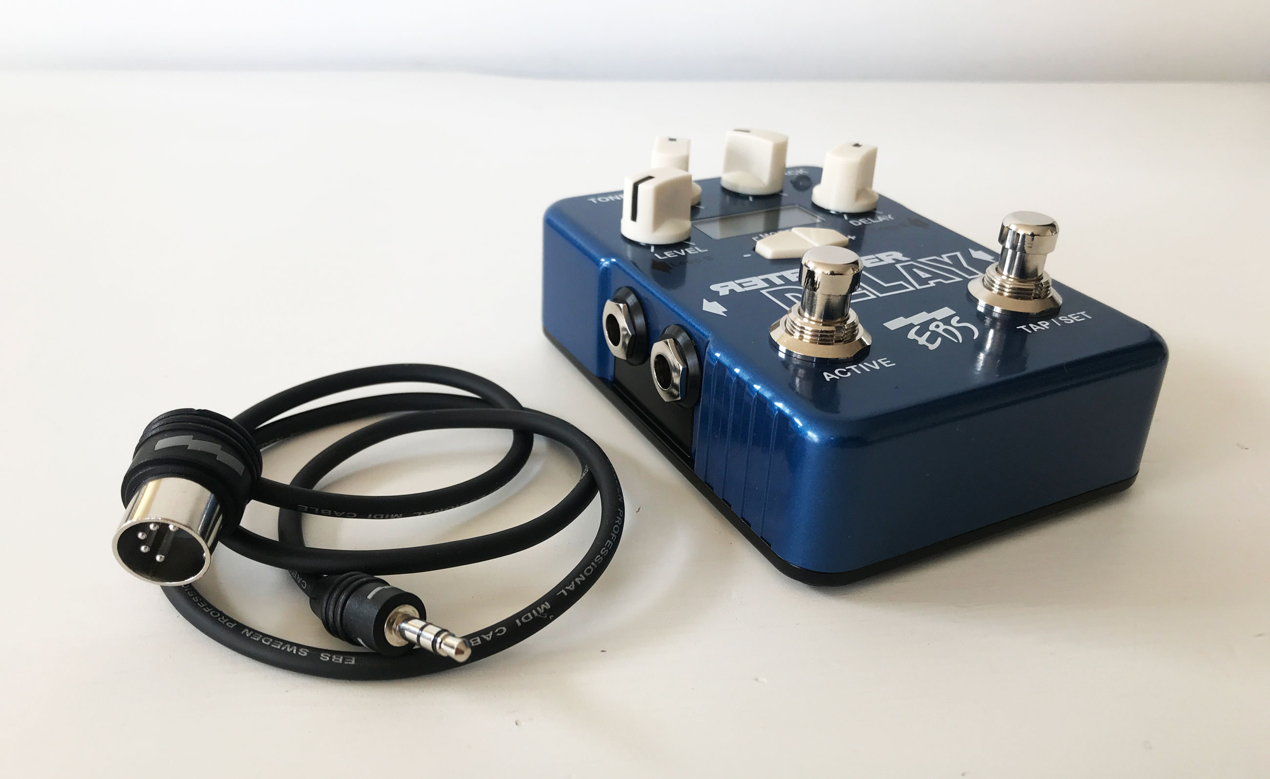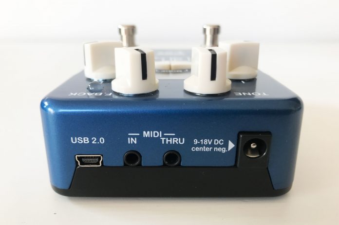 Ponadto efekt jest przystosowany do sterowania za pomocą komunikatów MIDI. Gniazda MIDI IN oraz THRU znajdziemy u góry obudowy, a w komplecie z efektem otrzymamy przejściówkę z wtyku DIN 5-pinowego na jack ⅛’’ TRS. Obok gniazd MIDI umieszczono także złącze USB 2.0 oraz wejście na zasilacz sieciowy o napięciu 9-18 V, co jest bardzo praktycznym rozwiązaniem, gwarantującym kompatybilność z różnymi systemami. Zasilania bateryjnego nie przewidziano – byłoby to rozwiązanie niepraktyczne i nieefektywne.
