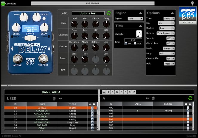 Ponieważ jednak poruszanie po menu widocznym na malutkim ekranie może niektórym nastręczać pewnych trudności, z pomocą przychodzi aplikacja Desktop Editor, którą pobrać możemy ze strony EBS. Należy przy tym pamiętać, by przed jej zainstalowaniem i uruchomieniem, zaktualizować firmware samego efektu, którego najnowsza wersja również jest dostępna na stronie producenta. Gdy już podłączyliśmy ReTracer Delay do komputera przez USB i poprawnie przeprowadziliśmy proces aktualizacji, jesteśmy gotowi do edycji ustawień. Dzięki przejrzystemu, dobrze zaprojektowanemu interfejsowi, na jednym ekranie zobaczyć możemy nie tylko wszystkie parametry brzmienia w formie wirtualnych potencjometrów, ale także rozwinąć i modyfikować pozostałe szczegóły, takie jak typ brzmienia (Engine), podział rytmiczny (Time).