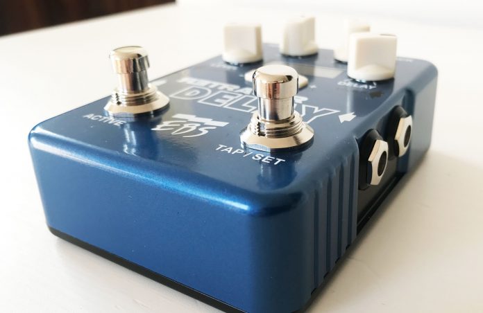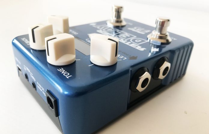 Wewnątrz przedmiot naszych testów – zaskakująco niewielkich rozmiarów (11 x 8 x 3 cm) i umiarkowanej, lecz budzącej zaufanie wagi (400 g) niebieska obudowa z dwoma footswitchami, parą przycisków i czterema typowymi dla tego rodzaju urządzeń potencjometrami (Level, Tone, Feedback, Delay). Czy tak nieduży efekt może się legitymować przydomkiem Delay Workstation? Już chwilę po podłączeniu okazuje się, że tak!