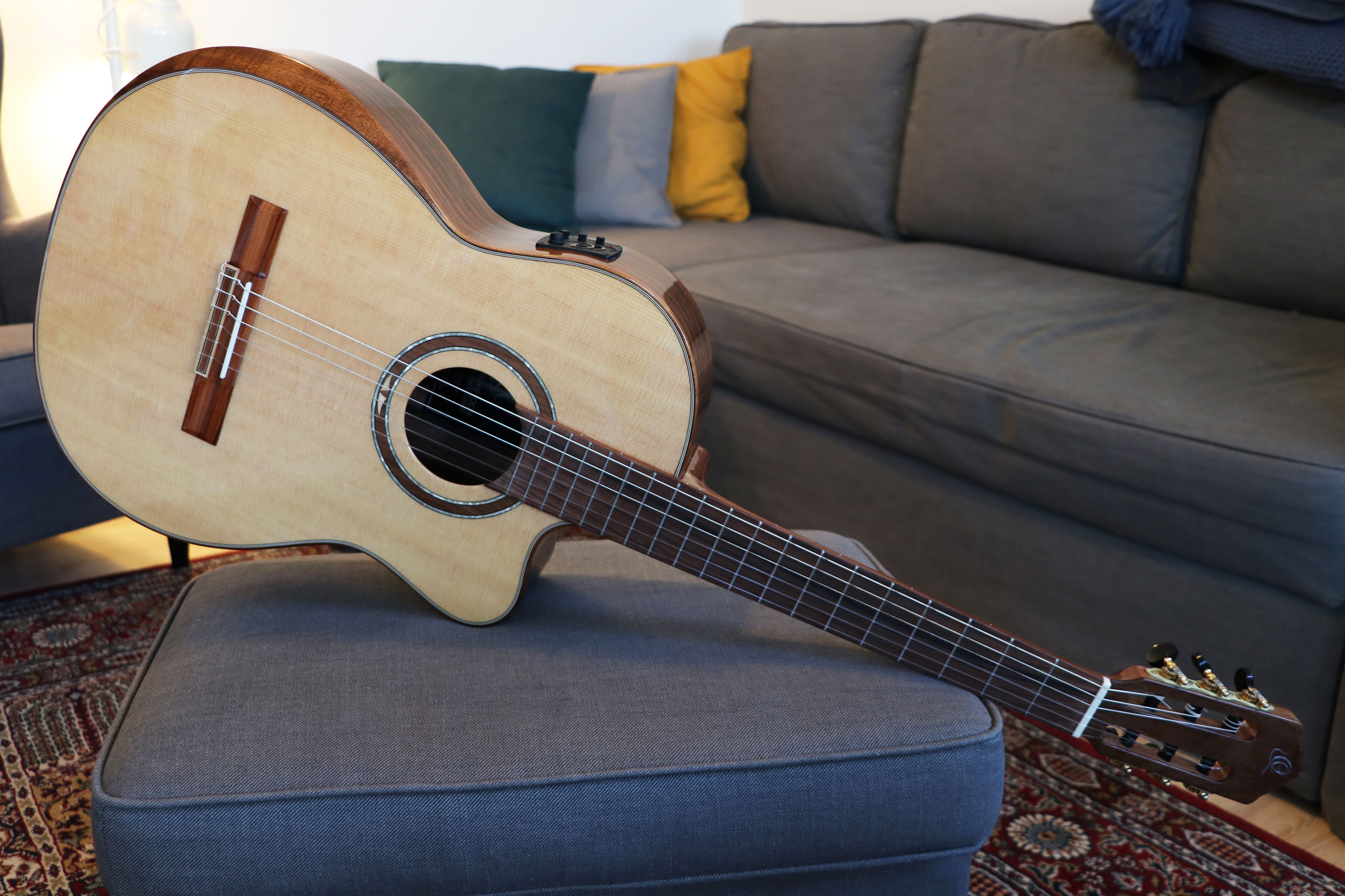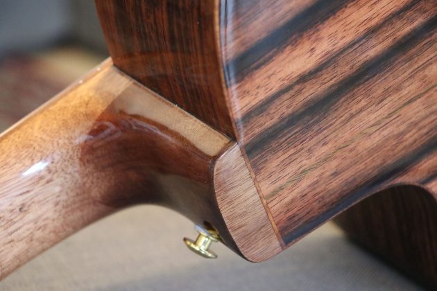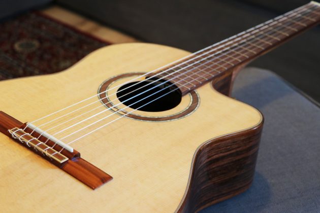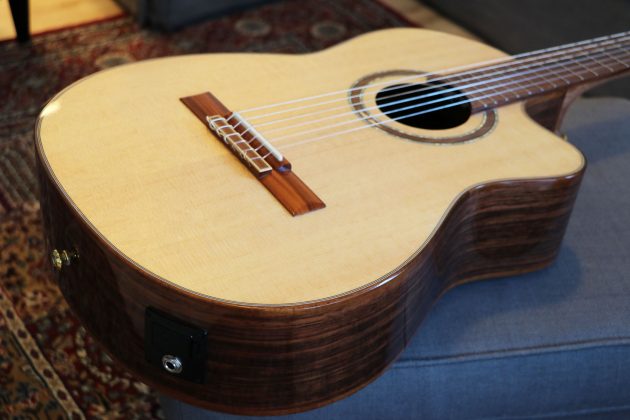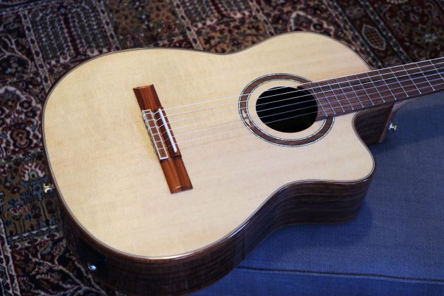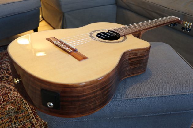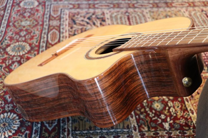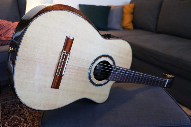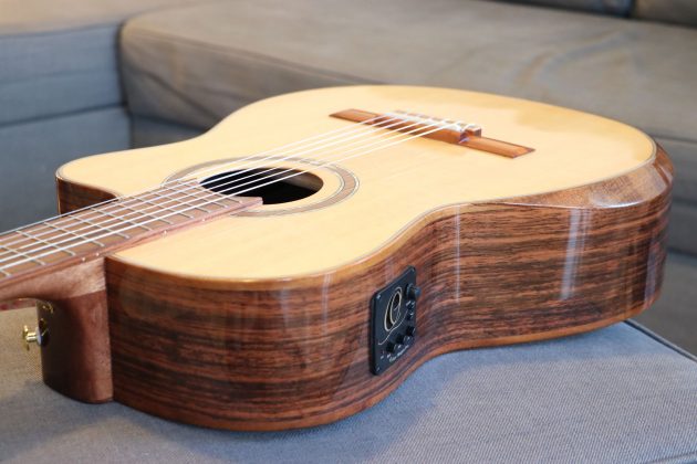 Jednym z moich ulubionych pomysłów zastosowanych w tej gitarze jest ręcznie robione wcięcie drewna w pudle rezonansowym, które służy do podpierania prawej ręki – dzięki temu ręka dobrze trzyma się korpusu przy czym może być swobodna i rozluźniona. Takie rozwiązanie jest stosowane już od dawna w gitarach elektrycznych jednak w gitarach klasycznych nie jest to często spotykane. Skoro już mowa o kształcie, warte odnotowania jest rodzaj korpusu, a mianowicie typ Cutaway dający łatwy dostęp do wyższych rejestrów.