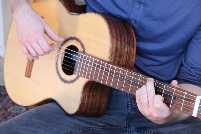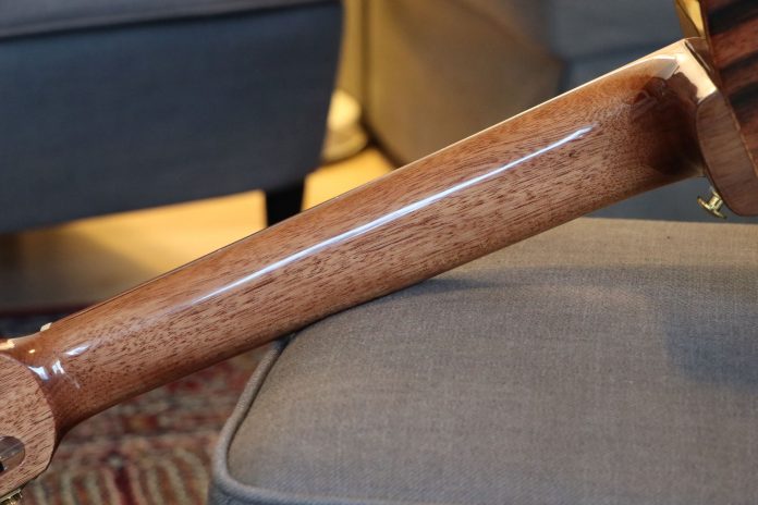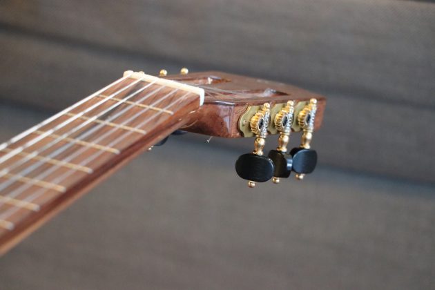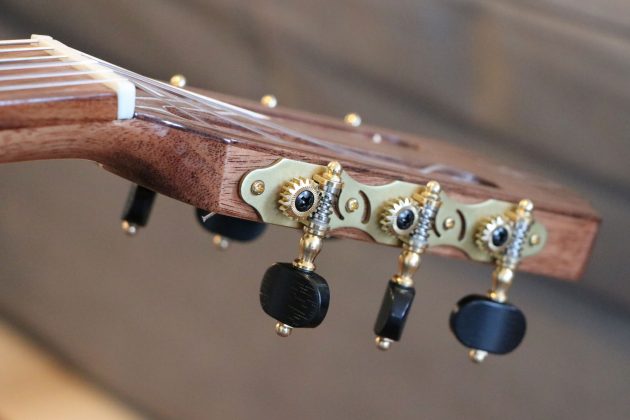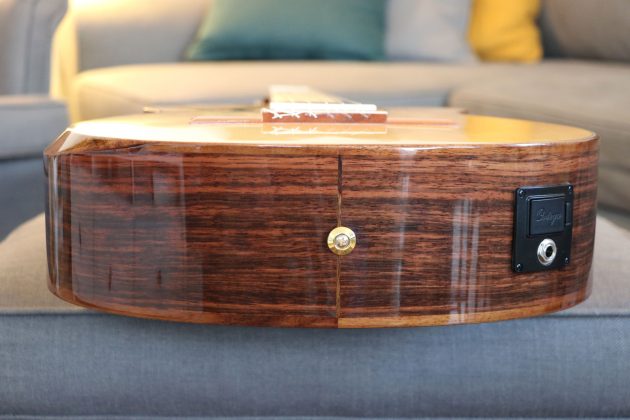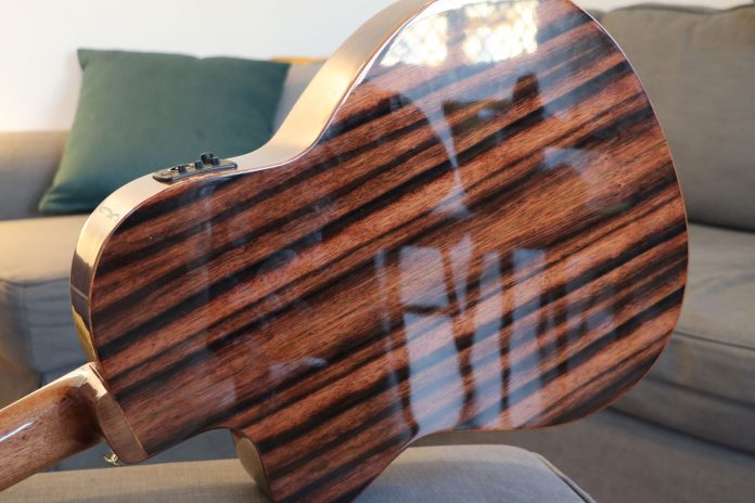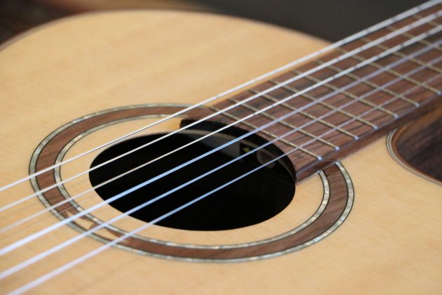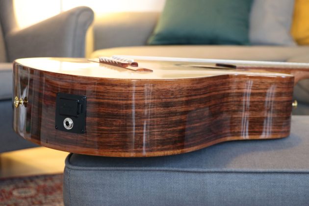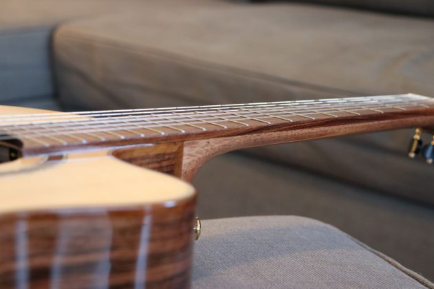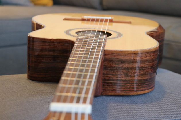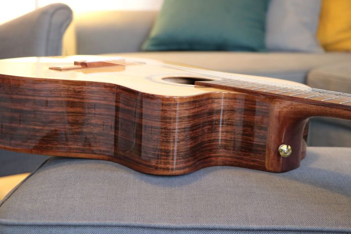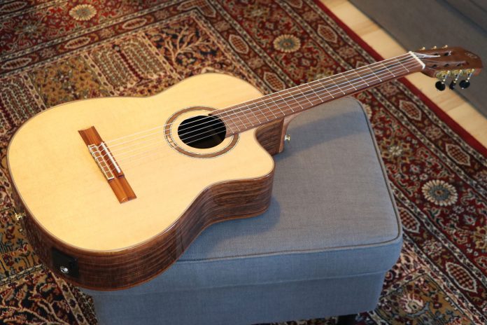 Jednym z moich ulubionych pomysłów zastosowanych w tej gitarze jest ręcznie robione wcięcie drewna w pudle rezonansowym, które służy do podpierania prawej ręki – dzięki temu ręka dobrze trzyma się korpusu przy czym może być swobodna i rozluźniona. Takie rozwiązanie jest stosowane już od dawna w gitarach elektrycznych jednak w gitarach klasycznych nie jest to często spotykane. Skoro już mowa o kształcie, warte odnotowania jest rodzaj korpusu, a mianowicie typ Cutaway dający łatwy dostęp do wyższych rejestrów.