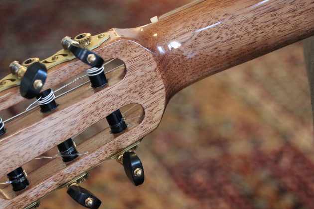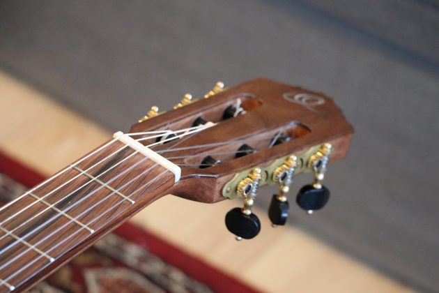 Gryf wykonany jest z Mahoniu. Podobnie jak heban jest ulubionym surowcem gitarzystów gustujących w mocniejszych brzmieniach. Tutaj natomiast mamy do czynienia z gitarą klasyczną, jednak wiele inspiracji pochodzi właśnie z gitar elektrycznych. Wróćmy do mahoniu… Gatunek ten ma jedną z największych gęstości co czyni go drewnem ciężkim, a to moim zdaniem jest dobra wiadomość. Bardzo przyjemnie trzyma się w ręku gryf, który waży. Lewa ręka może twardo stąpać po swojej „ziemi”.