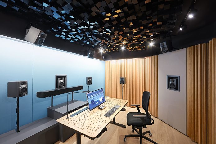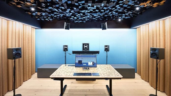 Studio wyposażone jest w rozbudowany system głośników 7.1.4 zapewniający kompatybilność pomiędzy nagraniami AMBEO, Dolby Atmos i Auro3D.