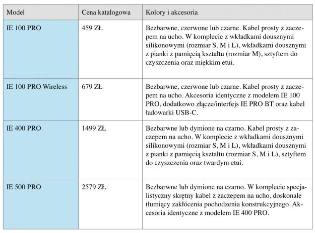 „Wybierając słuchawki bezprzewodowe IE 100 PRO Wireless, dostajemy niezwykły model „dwa w jednym”. Oprócz standardowych akcesoriów w komplecie słuchawki IE 100 PRO Wireless wyróżniają się złączem IE PRO BT – posiada interfejs Bluetooth, który pozwala zastąpić standardowy kabel specjalnym przewodem z modułem transmisyjnym, aby cieszyć się doskonałym bezprzewodowym dźwiękiem! W komplecie przewidziano kabel USB-C, który pozwala naładować interfejs Bluetooth w zaledwie półtorej godziny”