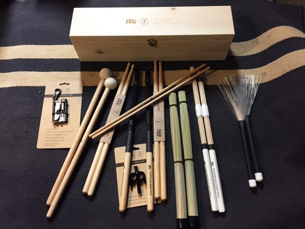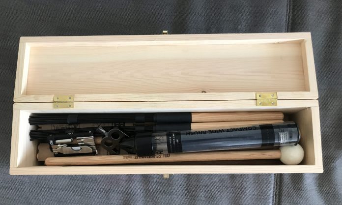 W bardzo eleganckim drewnianym pudełku opatrzonym logiem producenta, otrzymałem od firmy Meinl zestaw składający się z pałek i akcesoriów potrzebnych każdemu perkusiście. W skład wchodzą pałki drewniane, rózgi, miotełki oraz klucze do strojenia bębnów czyli wszystko to czego żaden bębniarz nie może pominąć w swoim perkusyjnym ekwipunku.