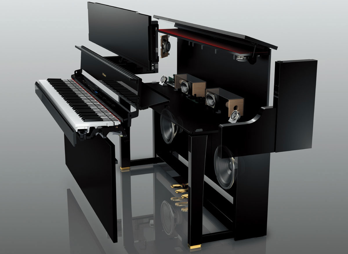• Wbudowane nagłośnienie składające się z ośmiu głośników, wiernie reprodukuje głębokie i bogate pole dźwiękowe pianina akustycznego