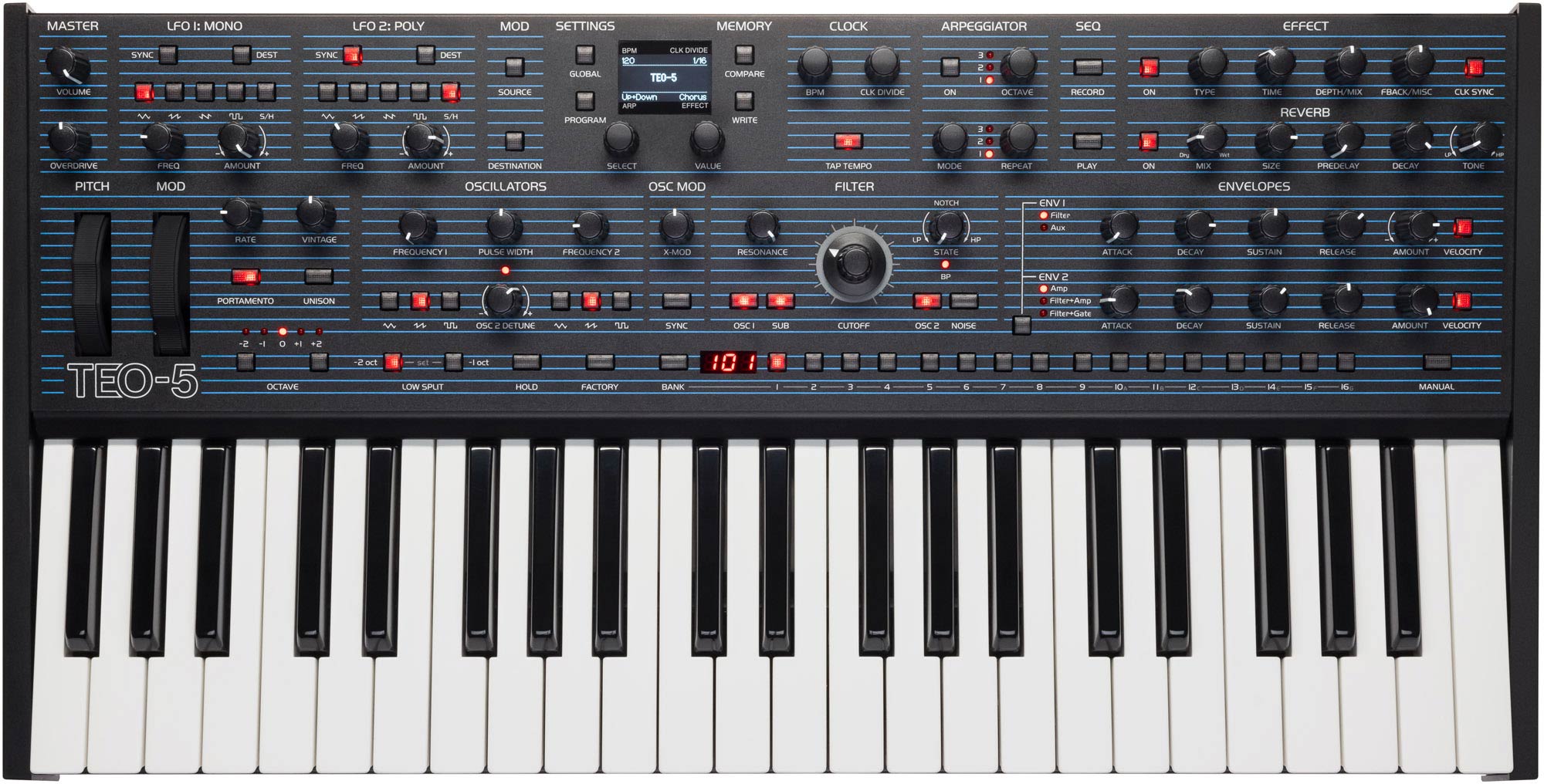 Instrument posiada klawiaturę premium marki Fatar, co gwarantuje responsywne i inspirujące doznania podczas gry. TEO-5 to nie tylko hołd dla przeszłości, ale również wyraz nowoczesnego podejścia do projektowania syntezatorów, czyniąc klasyczne brzmienia Oberheim dostępnymi dla szerszego grona muzyków.