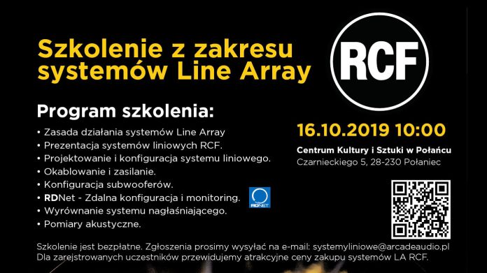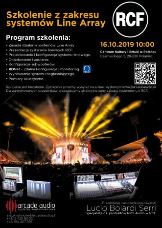 W imieniu firmy Arcade Audio, zapraszamy wszystkich zainteresowanych systemami nagłośnieniowymi Line Array do Centrum Kultury i Sztuki w Połańcu na bezpłatne szkolenie z zakresu systemów liniowych. Na szkoleniu będzie można posłuchać topowej serii RCF TTL oraz systemów liniowych HDL.
