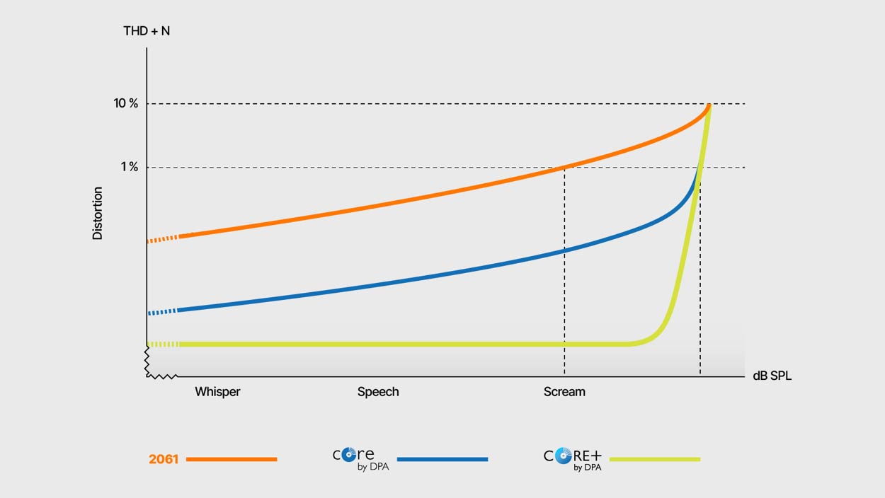 Na wykresach porównawczych mikrofonów DPA z technologią CORE i CORE+ widać, że zniekształcenia harmoniczne (THD) w przypadku CORE+ są praktycznie niezauważalne. Płaska charakterystyka THD na całej rozpiętości dynamicznej potwierdza, że mikrofony te dostarczają dźwięk, który ogranicza jedynie naturalny szum systemowy.