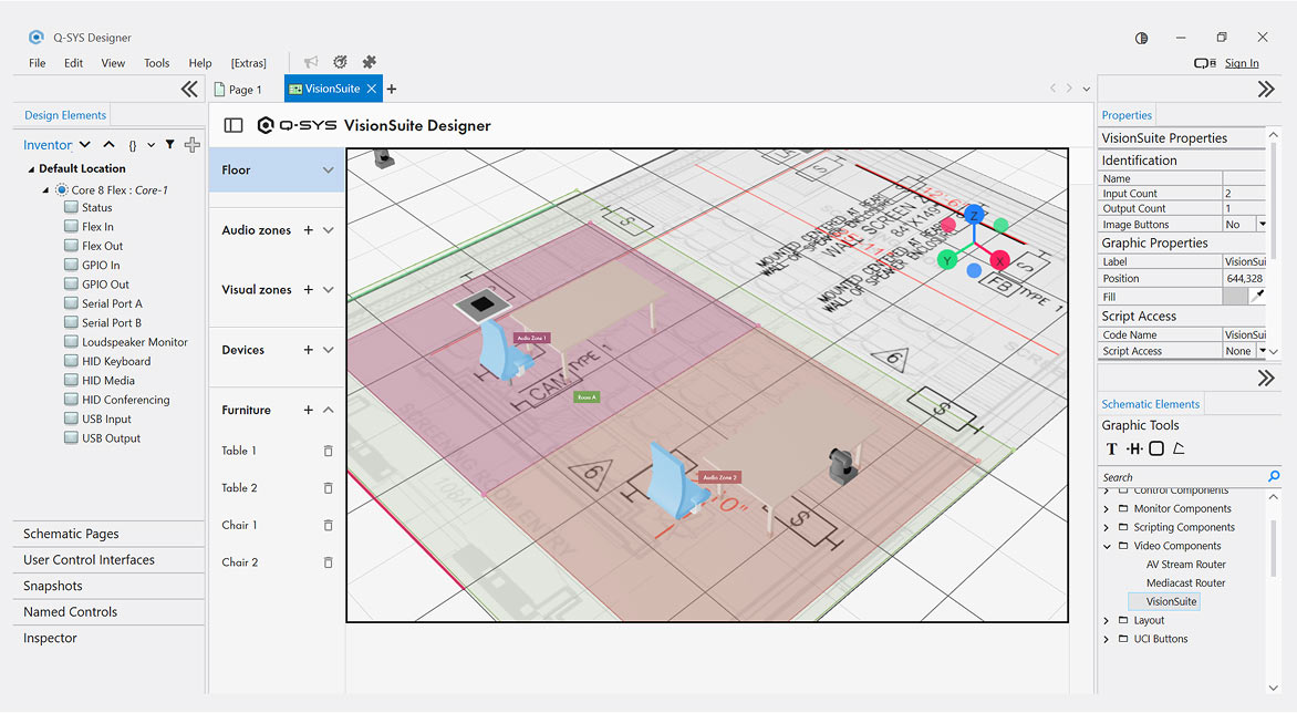 Sercem tych funkcji jest VSA-100 VisionSuite AI Accelerator – dedykowane urządzenie Q-SYS do obsługi zaawansowanej automatyzacji, zintegrowane z nowym narzędziem VisionSuite Designer do projektowania i wizualizacji 3D przestrzeni.