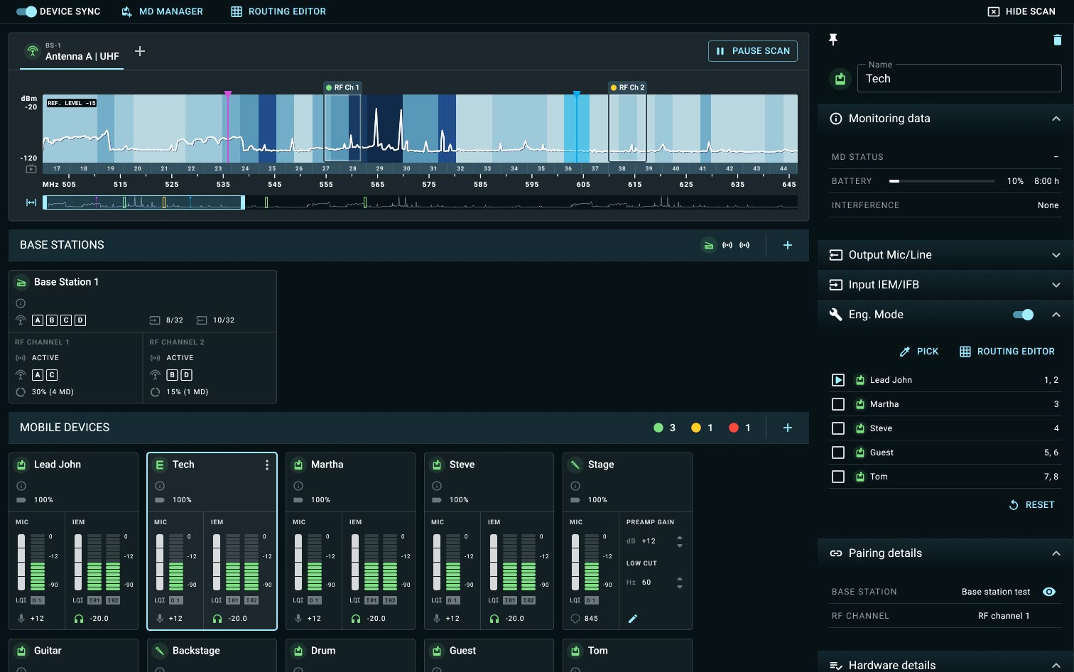 • Tryb dla inżyniera dźwięku z 16 miksami IEM pozwala większej liczbie osób (np. pomocników, producentów, prowadzących) mieć dokładny odsłuch sceny bez potrzeby dodatkowych stacji odsłuchowych.