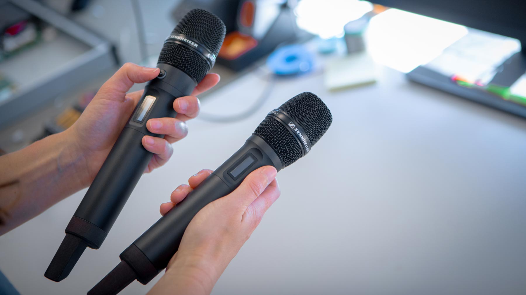 Prototypy mikrofonów SKM w pasmach UHF i 1,4 GHz dostępne do testowania na IBC. Po lewej mikrofon z zamontowanym adapterem Command.