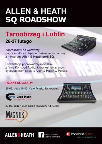 W imieniu przedstawiciela marki Allen&Heath w Polsce, firmy Konsbud Audio, zapraszamy na prezentację nowych mikserów cyfrowych Allen&Heath z serii SQ, która odbędzie się 26 i 27 lutego 2018 w Tarnobrzegu i Lublinie.