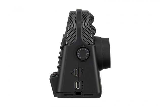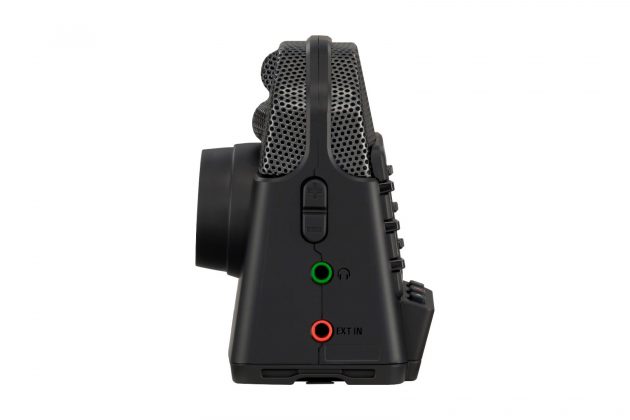 Jeśli chodzi o zapis audio, Zoom Q2n-4K podobnie jak jego poprzednik ma wbudowane dwie kapsuły pojemnościowe ułożone pod kątem 120 stopni w konfiguracji XY, pozwalające na nagrania stereo o szerokim zakresie panoramy. Zakres wzmocnienia możemy regulować od zera do +39 dB, a maksymalny poziom SPL jaki mogą przyjąć te mikrofony to 120 dB. W praktyce pozwala to nawet na rejestrację zestawu perkusyjnego bez przesterowania wejścia. Alternatywnie do Q2n-4K możemy także podłączyć zewnętrzny mikrofon (jack 1/8” Ext In), jeśli na przykład korzystamy z tzw. krawatówki czy shotguna. Obok wejścia Ext In znajdziemy wyjście słuchawkowe z osobną regulacją głośności.