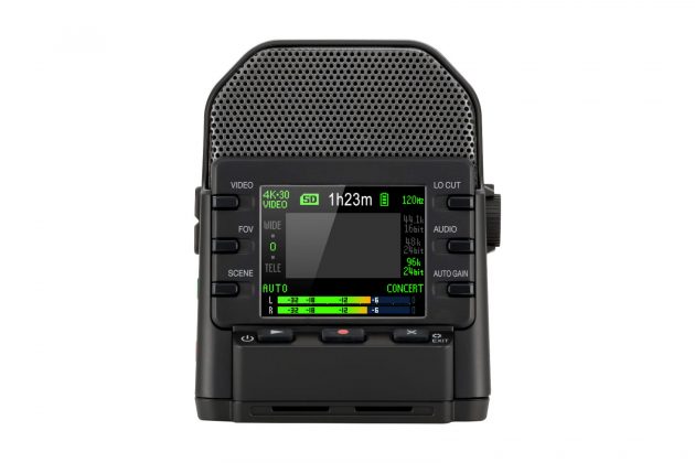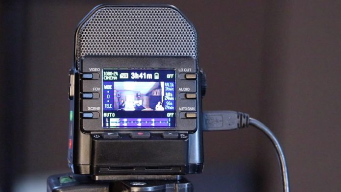 Aby zacząć korzystać z Zoom Q2n-4K, wystarczy go po prostu włączyć… Dosłownie! Małymi przyciskami umieszczonymi po lewej stronie ekraniku wybierzemy tryb obrazu, format kadru i preset sceny. Przyciski po prawej odpowiadają za funkcje audio: filtr dolnozaporowy (80 Hz, 120 Hz, 160 Hz lub wyłączony), jakość zapisu dźwięku oraz poziom wzmocnienia – możemy wybrać jeden z automatycznych presetów (Concert, Solo, Meeting) lub zrobić to samemu za pomocą pokrętła na prawym boku obudowy.