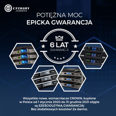 Jak informuje firma ESS Audio, dystrybutor marki CROWN w Polsce, wszystkie nowe, wzmacniacze kupione w Polsce od 1 stycznia 2020 do 31 grudnia 2021 objęte są 6-letnią gwarancją, bez dodatkowych kosztów!