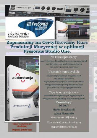 Dodatkową korzyścią, płynącą z warsztatów jest uzyskanie międzynarodowego certyfikatu Presonus End User oraz możliwość skorzystania z 50% rabatu na zakup oprogramowania.