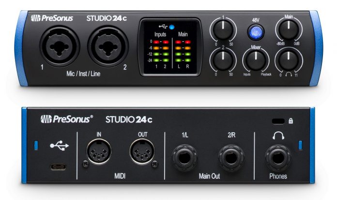 Studio 24c jest doskonały do home recordingu, dla mobilnych muzyków, gitarzystów, podcasterów i transmisji na żywo. Jest zasilany z magistrali i ma dwa wejścia mikrofon/linia/instrument i dwa wyjścia liniowe z regulowanym bezpośrednim monitoringiem sygnału.