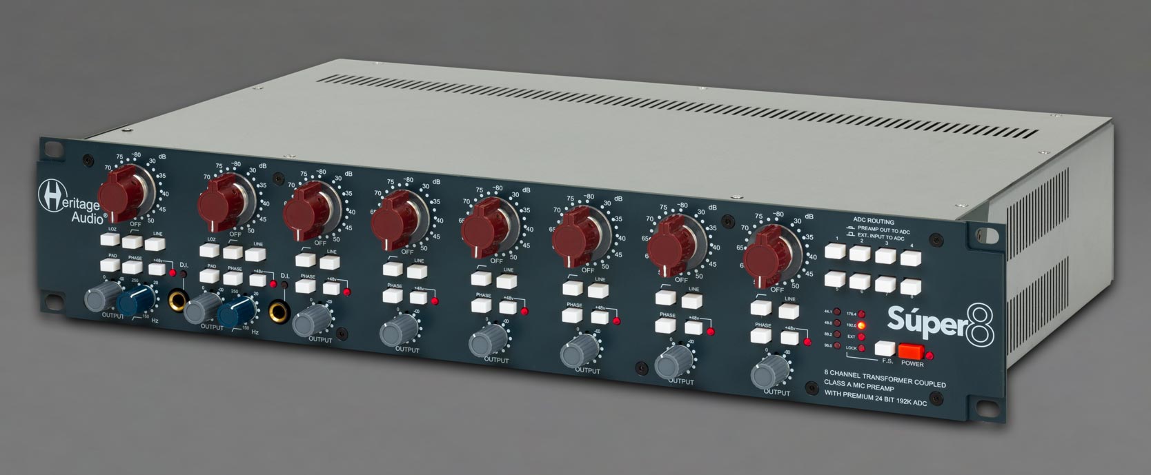 Heritage Audio Super 8 to ośmiokanałowy przedwzmacniacz mikrofonowo-liniowy klasy A w stylu brytyjskiej „73-ki“, oferujący niezależne zasilanie phantom 48 V, filtr LO CUT (-3db przy 80Hz) i przycisk PHASE (odwrócenie polaryzacji) na każdym z kanałów.