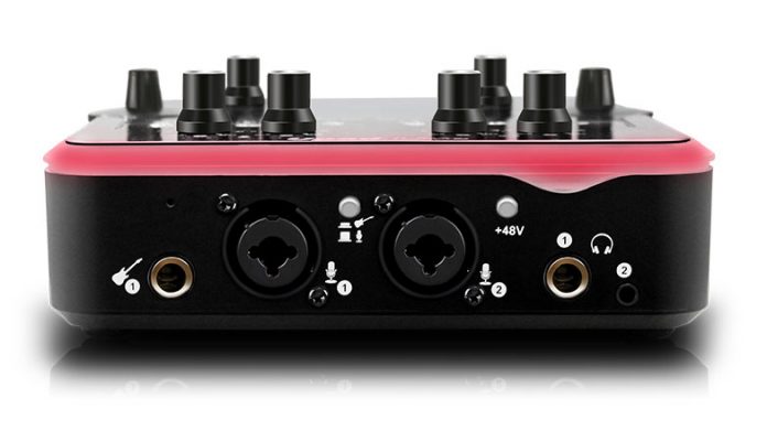 Interfejs ma dwa wejścia mikrofonowo-liniowe XLR/TRS obsługujące zarówno mikrofony dynamiczne, pojemnościowe z zasilaniem 48 V (wejście 1), jak i 5 V (wejście 2). Ponadto wejście 1 działa zamiennie z wejściem instrumentalnym, do którego bezpośrednio podłączyć możemy gitarę czy bas. Dwa wyjścia słuchawkowe TRS 6,3 mm i 3,5 mm z niezależną regulacją głośności pozwalają na wypuszczenie odsłuchu dla dwóch osób jednocześnie.