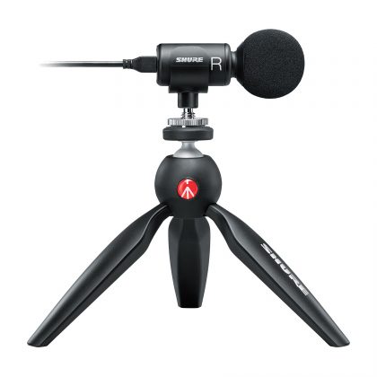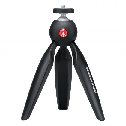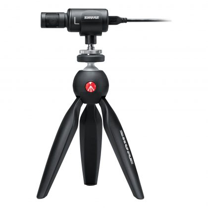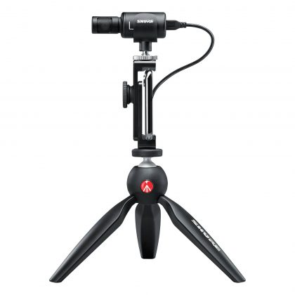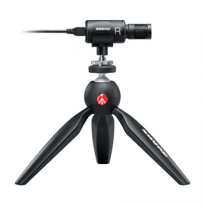 • MV88+ VIDEO KIT to tak naprawdę statyw Manfrotto PIXI, uchwyt na telefon i uchwyt na mikrofon, kable USB-C i lightning wraz z genialnie przyjętym cyfrowym pojemnościowym mikrofonem stereofonicznym Shure Motiv MV88+