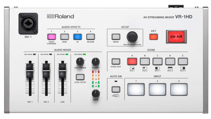 Roland VR-1HD wyposażony jest w trzy wejścia HDMI, a każdy z nich akceptuje praktycznie wszystkie rozdzielczości video w tym oczywiście HD i komputerowe. Pozwala to łączyć, przełączać i przesyłać strumieniowo różne źródła, w tym kamery, prezentacje, a nawet smartfony czy tablety podpięte do niego. Dźwięk z tych źródeł można miksować z dwoma wejściami mikrofonowymi XLR o jakości studyjnej i dedykowanym wejściem liniowym. Co najważniejsze, ponieważ VR-1HD jest przeznaczony do transmisji na żywo, jego dedykowane elementy sterujące wraz z dołączonym mikrofonem na gęsiej szyi, pozwalają na swobodne korzystanie z zestawu głośnomówiącego także bez użycia zestawu słuchawkowego podczas transmisji na żywo.