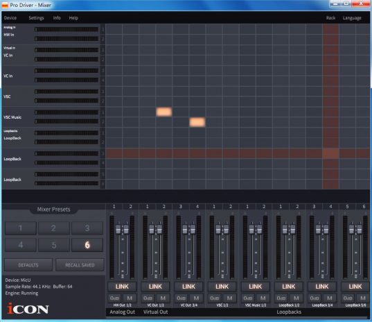 W mikserze tym możemy nie tylko sterować ustawieniami interfejsu i ustalać poziomy poszczególnych sygnałów w celach odsłuchowych, ale także zarządzać połączeniami pomiędzy kanałami wejściowymi i wyjściowymi (w tym również wirtualnymi, co daje szersze pole manewru i możliwości całkiem zaawansowanego routingu). W tym celu możemy użyć zarówno matrycy wejść i wyjść, jak i wirtualnego racka efektowego, w którym myszką przeciągamy „kabelki“ pomiędzy wybranymi punktami. Tutaj także wpinać możemy wtyczki VST dołączone w komplecie z urządzeniem, a także dowolne inne, które mamy już zainstalowane na naszym komputerze. W ten sposób nawet bez żadnego programu DAW jesteśmy w stanie poddać sygnał wejściowy podstawowej albo też mocniejszej obróbce – czy to przed nagraniem, czy w celach czysto osłuchowych bądź też transmisyjnych.