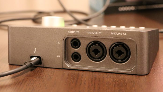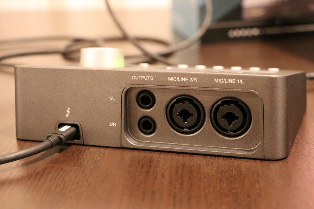 Tutaj kolejne istotne uzupełnienie… Jak wspomniałem wcześniej, na tylnym panelu mamy do dyspozycji dwa wejścia/kanały typu combo. Jednak jak zauważycie na zdjęciu, na froncie interfejsu, po prawej stronie mamy wspomniane wcześniej gniazdo słuchawkowe, a po lewej wejście gitarowe typu Hi-Z (o wysokiej impedancji), które umożliwia bezpośrednie podpięcie gitary elektrycznej lub basowej. Warto dodać, że nie jest to kolejne, dodatkowe wejście, gdyż po wpięciu w nią gitary automatycznie wyłączamy pierwszy kanał na tylnym panelu.